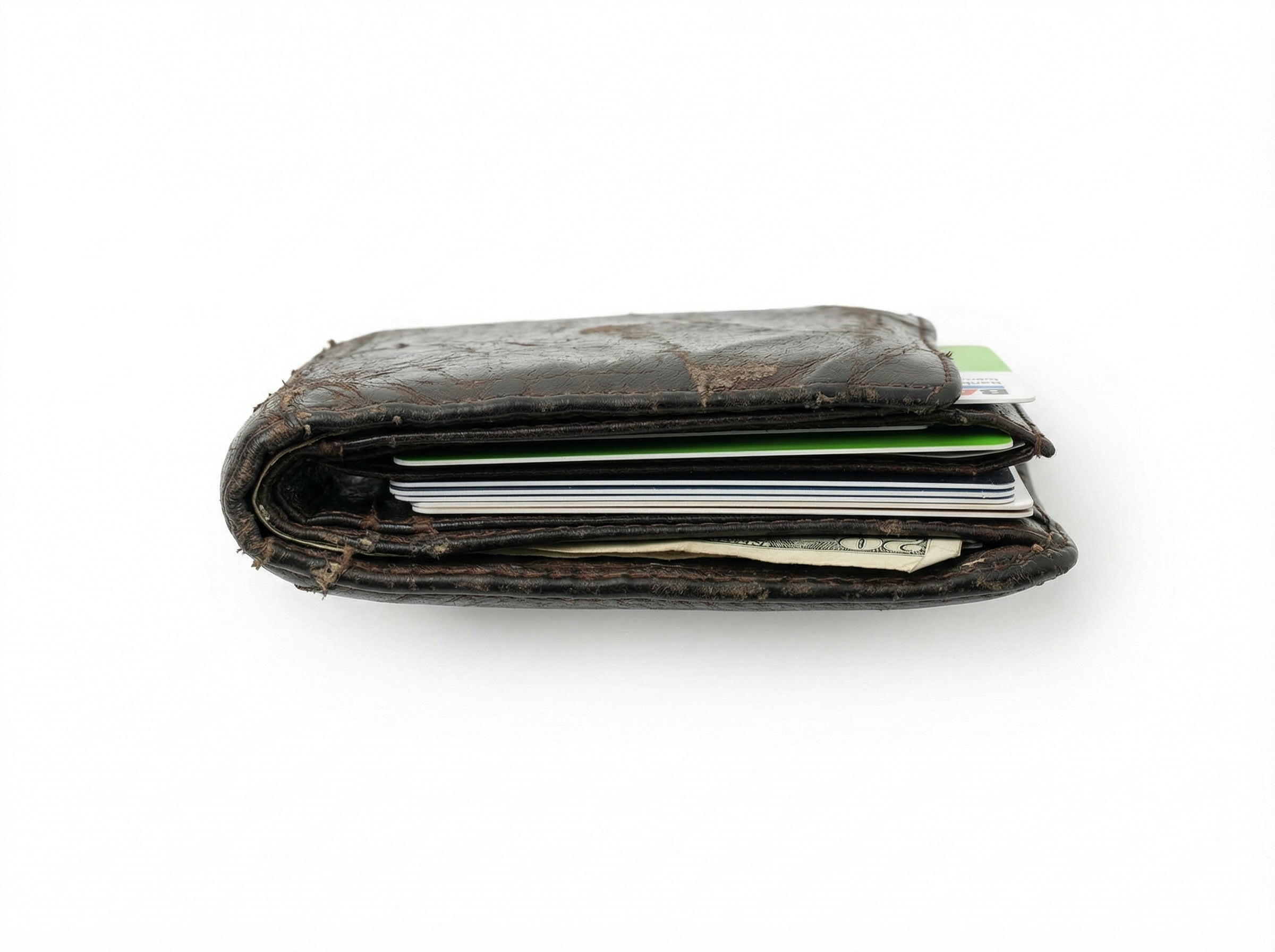 Avant : portefeuille gonflé, poche déformée, cartes introuvables.
