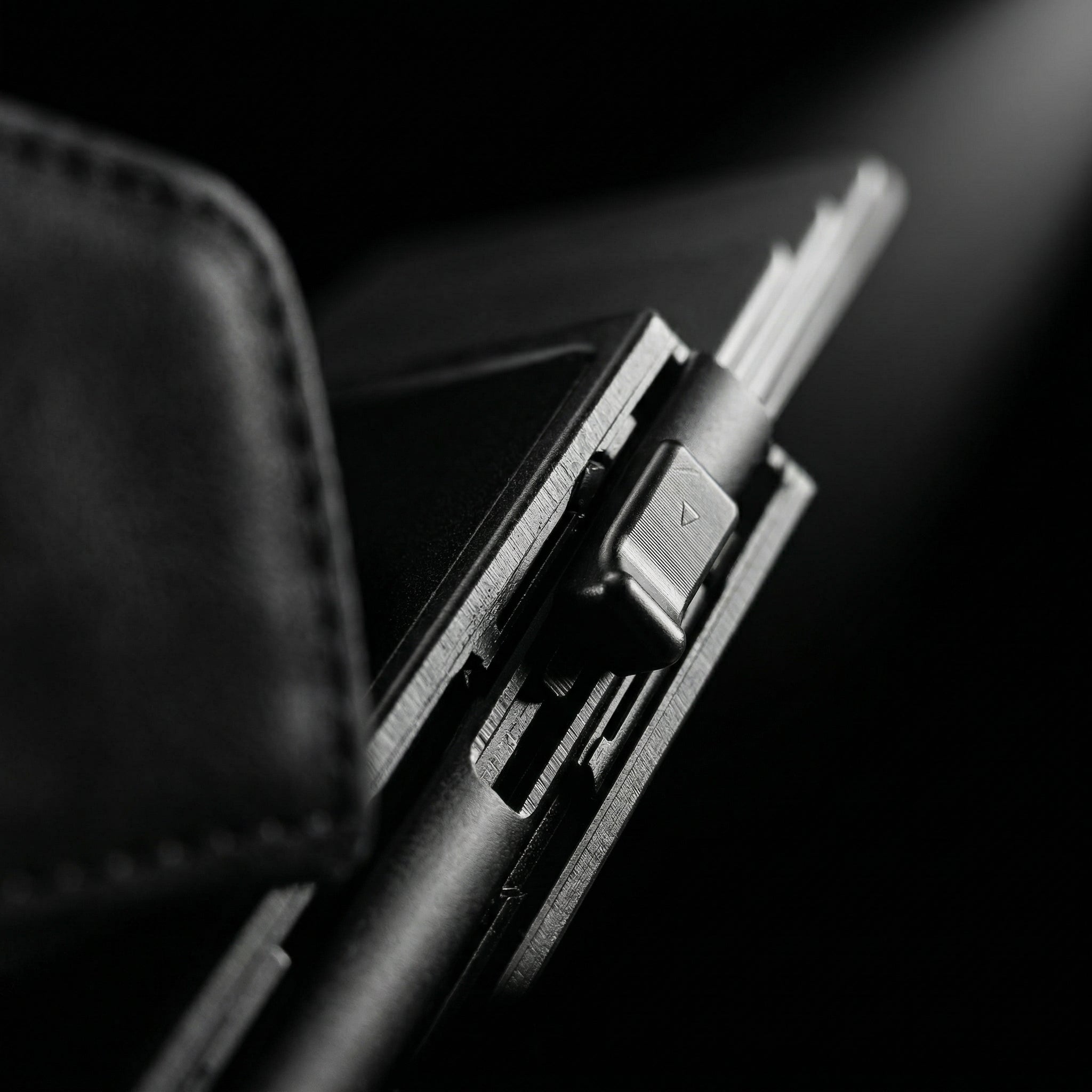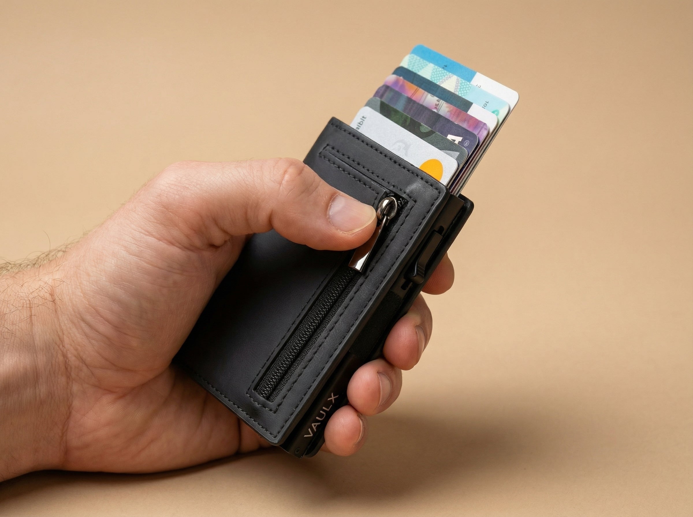 Le VAULX est équipé d'une protection RFID qui bloque tout scan non autorisé de tes cartes bancaires. De plus, grâce au mécanisme "Flip", tes cartes ne peuvent s'éjecter que lorsque tu appuies volontairement sur le bouton. En dehors de ça, elles restent fermement maintenues en place.