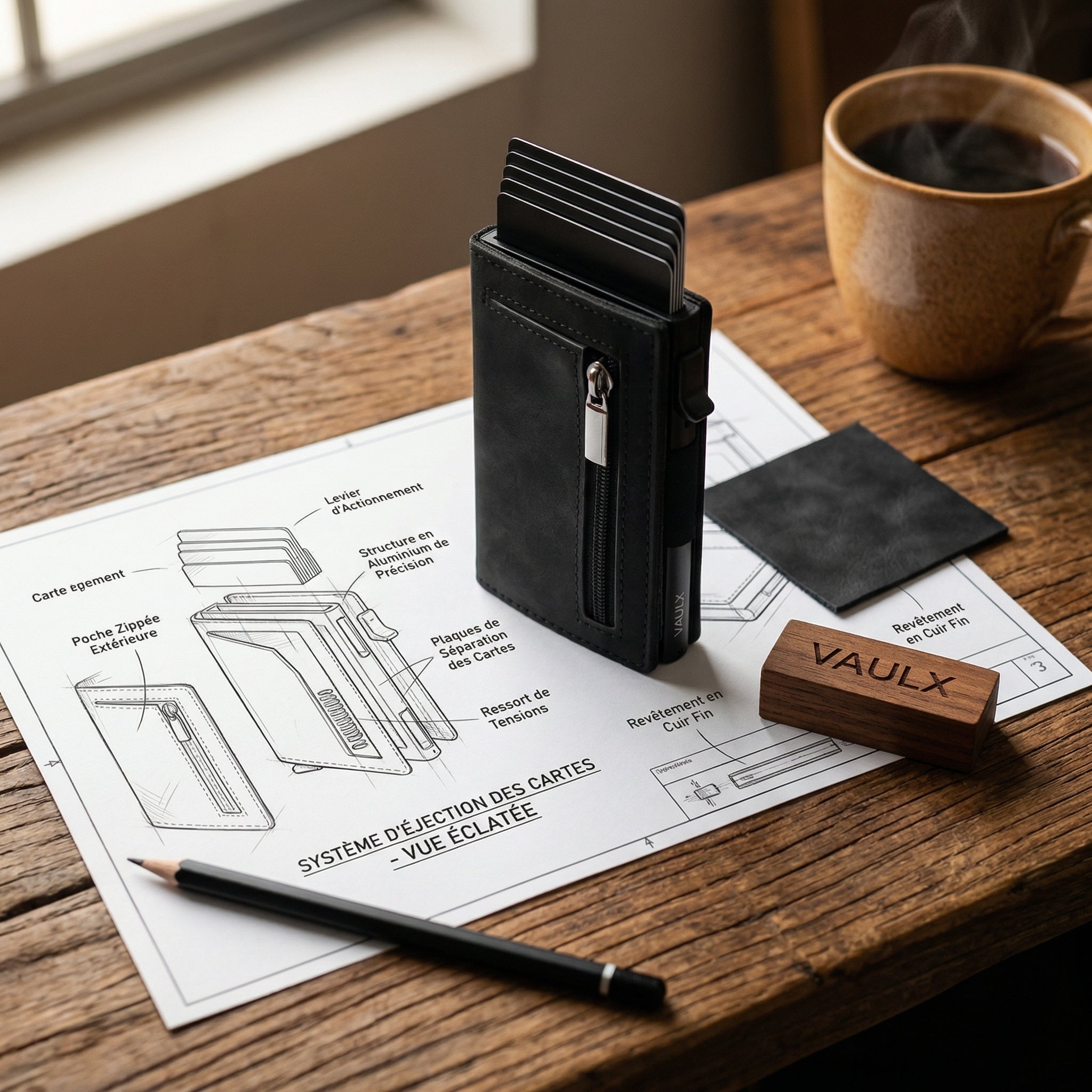 Le VAULX se distingue par la combinaison de trois éléments rares à ce prix : un mécanisme d'éjection aluminium véritable, une protection RFID intégrée, et un cuir premium. Pas de plastique, pas de compromis. Un produit pensé pour durer et pensé pour toi.