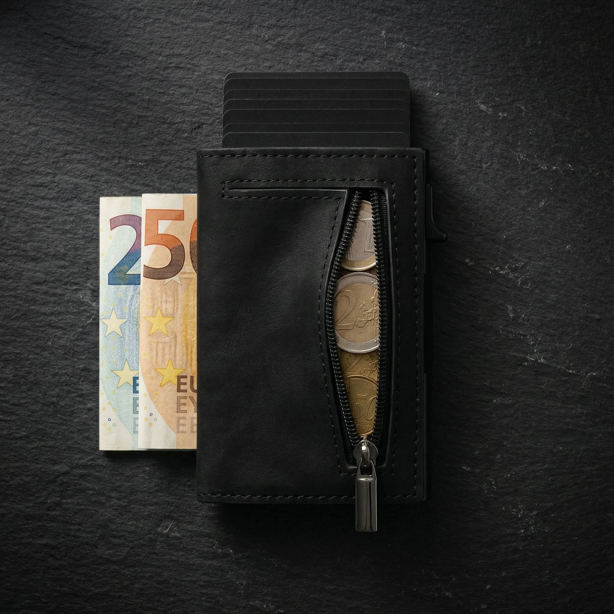 Même chargé au maximum — 11 cartes, billets et pièces — le VAULX reste remarquablement slim. Son mécanisme aluminium alvéolé optimise l'espace sans jamais déformer ta poche. Plusieurs clients nous ont confié avoir été surpris par sa finesse une fois en main.